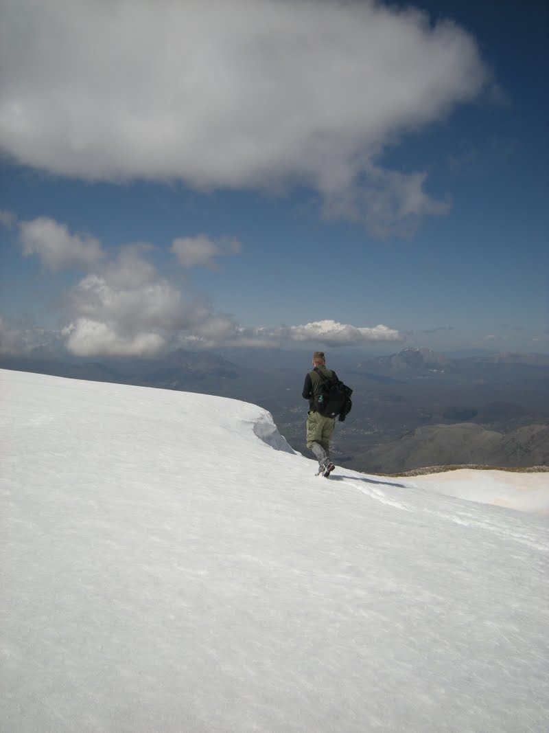 Chiudo la porta di casa e penso già di non aver scuse per lasciar tutto e andarmene fuori stamane: ma la montagna, già visibile dal terrazzo sul finire della notte con la luna ancora in cielo, sembra invitare ad una giornata speciale. Le premesse ci sono e, solito gruppetto di amici, ci ritroviamo all'Impiso quasi senza accorgercene, scarponi calzati e zaino in spalla siamo in un'ora al Colle Gaudolino: la neve compatta e dura sui perorsi a Nord ci aiuta nel cammino: decidiamo dopo un consulto di muoverci verso sud per prudenza, non siamo tutti equipaggiati di ramponi e pertanto meglio muoversi dove il sole ammorbidisce un po' gli strati: questo il pensiero "previdente" che ci spinge a salire su fronti esposti a Sud verso la Serra del Prete. Pochi metri, però, e ci rendiamo conto che la neve è già molle, il sole già caldo, l'aria tersa e priva di vento. Si suda e si fatica ma procediamo lungo il sentiero visibile solo a seguire i segni bianco/rossi CAI sugli alberi, a volte quasi sommersi dalla neve. Siamo già fuori dal bosco e le fronti grondano di sudore: meraviglioso il canale SO del monte Pollino si presenta alla vista in tutto il suo sviluppo, dalle nuove riprese arboree fino alla cresta, purtroppo, con poca neve. Due fichi secchi ed un po' d'acqua per riprendere con nuovo vigore la progressione verso l'alto: lascio i bastoni agganciati allo zaino e prendo la picca più per voglia che per vera necessità: gli altri scelgono percorsi meno innevati io voglio provare il ripido, oggi almeno provare, la primavera sta già riconquistando le cime e la neve lascia il terreno ai nuovi germogli. Mi immergo così in una conca bianca, sotto la vetta nel lato meno esposto al sole e provo un po' la sofferenza e l'emozione di un po' di ripido: la neve è molle ma mi piace lo stesso, ennesima palestra di prova. Non più di 15-20 passi e sono piegato a respirare sulla piccozza: la neve risplende: capillari strati di acqua scorrono in superficie ed è bello sentire il corpo ed il respiro in armonia per quanto faticosa sia questa progressione; così spingo a sentire le gambe dolenti cercando verso l'alto il bianco: mi accorgo di vivere attimi di immenso me stesso, una interiorità che difficilmente ritrovo, gli altri sono aldilà della cresta e non visibili: pochi minuti ancora e la bianca salità finirà, già il verde delle praterie di vetta affiora sotto il bianco. Pochi altri metri sulla linea di cresta e sono sul cucuzzolo più alto della serra, ancora innevato: mi inginocchio oggi, non so perchè, ma sono in pace con tutto e sento di ringraziare dal profondo piegato su me stesso: è questa la mia, la nostra Pasqua: non c'è un filo di vento ora, mezzogiorno appena passato e tutto si vede a perdita d'occhio. Non si può non ringraziare quando si vivono certi momenti: riuniti, ci fermiamo a guardarci intorno e a respirare pienamente questi attimi di felicità. Oggi la vetta non ci da fretta, ci stendiamo per una buona mezz'ora prima di riprendere il cammino verso sud, verso il Belvedere / Valle del Malvento. La discesa ci offre belle emozioni quando c'è neve (si scia sugli scarponi -chi più chi (io) meno) e un po' di sofferenza alle articolazioni sulla cresta piena di pietre sconnesse. La veduta dal belvedere è sempre un bello spettacolo vetrina di loricati aggrappati sulle rocce. Il piano Ruggio per la sua esposizione è ancora ricoperto di neve ed è fondale perfetto per i nostri volti coloriti di sole e di serenità per la giornata trascorsa: riguadagniamo il Colle dell'Impiso sulla strada asfaltata che sembra un tappeto per le gambe e salutiamo, insieme con altri escursionisti, la montagna che oggi ci ha donato una Pasqua indimenticabile.